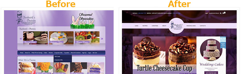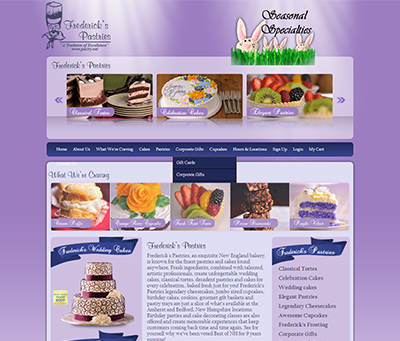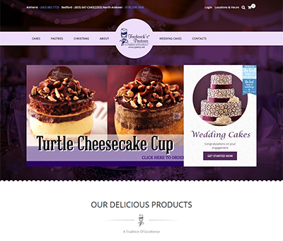 The team at Frederick's Pastry's needed a flashy new website to better display their decorative cakes and pastries. We used high resolution, zoomed-in images of their products so their customers could better visualize the mouthwatering taste of the sweets. We also emphasized their three New Hampshire locations to help increase foot traffic to their stores.